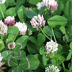 a temperate legume that grows to over 80 cm tall but remains prostrate when grazed with hollow, hairless stems with three hairless trifoliate leaflets. Leaflets are generally plain green while others have white to silver, pink or purple markings, flowers in clusters head 2 - 3 cm in diameter, small white-pink flowers, self-seeding annual, 3-4 Seeds in a Pod which shatter easily on maturity. Used as a part of permanent pastures, or in hay mixtures or cover crops